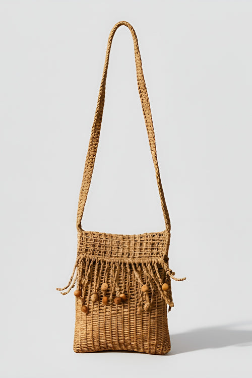 Hasır Boncuklu Ve Püsküllü Örme Ayarlanabilir Askılı Telefon Çantası